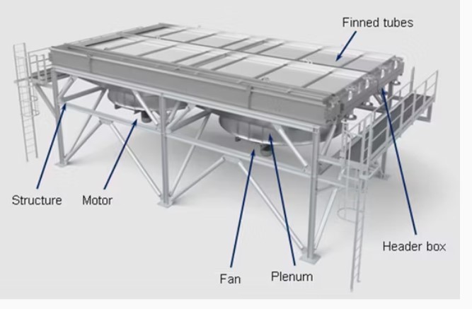 when excess or bypass steam enters the dump condenser, which is a network of tubes surrounded by fins, fans drive ambient air across these fins and tubes. The air absorbs heat from the steam, cooling and condensing it into liquid. This condensed water is collected and typically returned to the system for reuse. This process manages steam pressure fluctuations and prevents excess steam released into the atmosphere