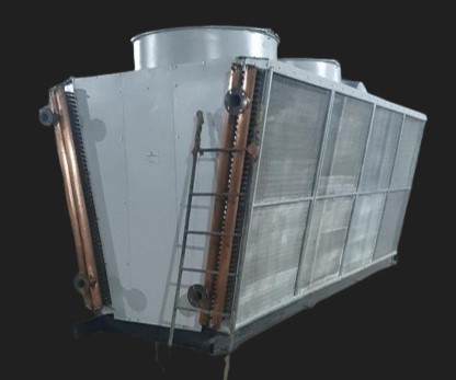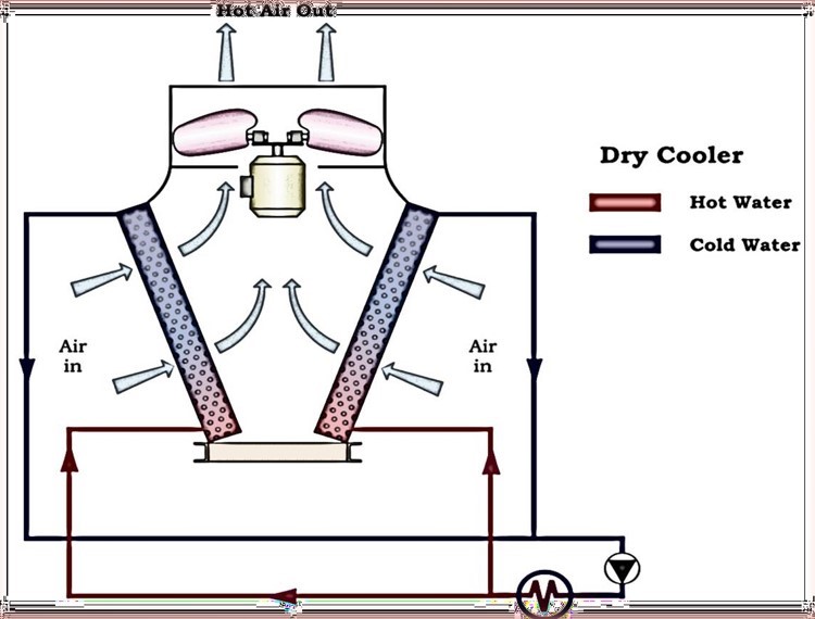 Dry cooler is a heat rejection equipment where the excess process heat is rejected to the atmosphere. It works on the principle of convection and conduction to dissipate heat from process fluid to air; the process fluid passes through the tubes and air stream is passed over the tubes to carry away the heat; air streams are created by the fans mounted on the unit.