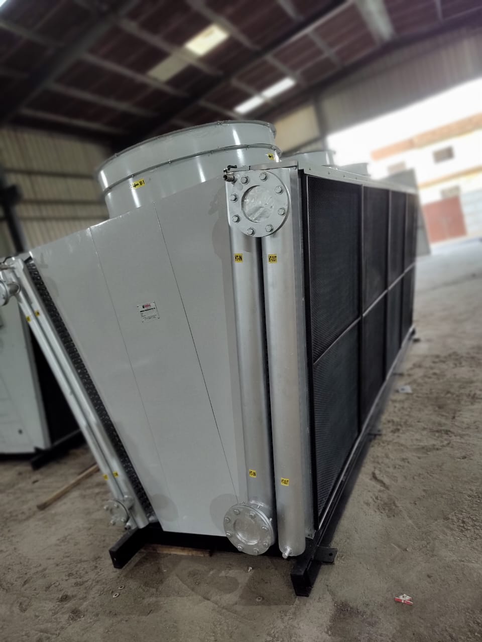 An air-cooled fluid cooler (also sometimes called an air-cooled heat exchanger or dry cooler) is a device used to remove heat from a fluid (usually water, glycol, or oil) without the use of water-based cooling towers. Instead, it uses ambient air to cool the fluid via a heat exchanger and fans.